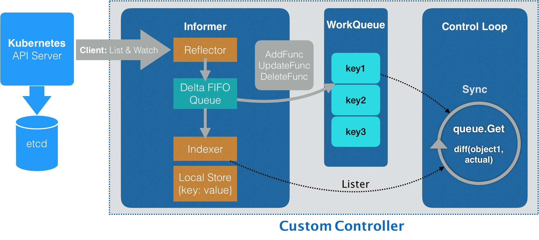 CRD:Custom Resource Definition,自定义的资源对象,即yaml文件中的Kind,如Operator就是实现CRD的控制器,之后直接使用Operator创建的CRD声明对象即可使用