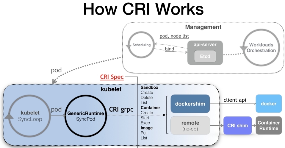 kubelet:负责创建、管理各个节点上运行时的容器和Pod,这个交互依赖CRI的远程调用接口,通过Socket和CRI通信;