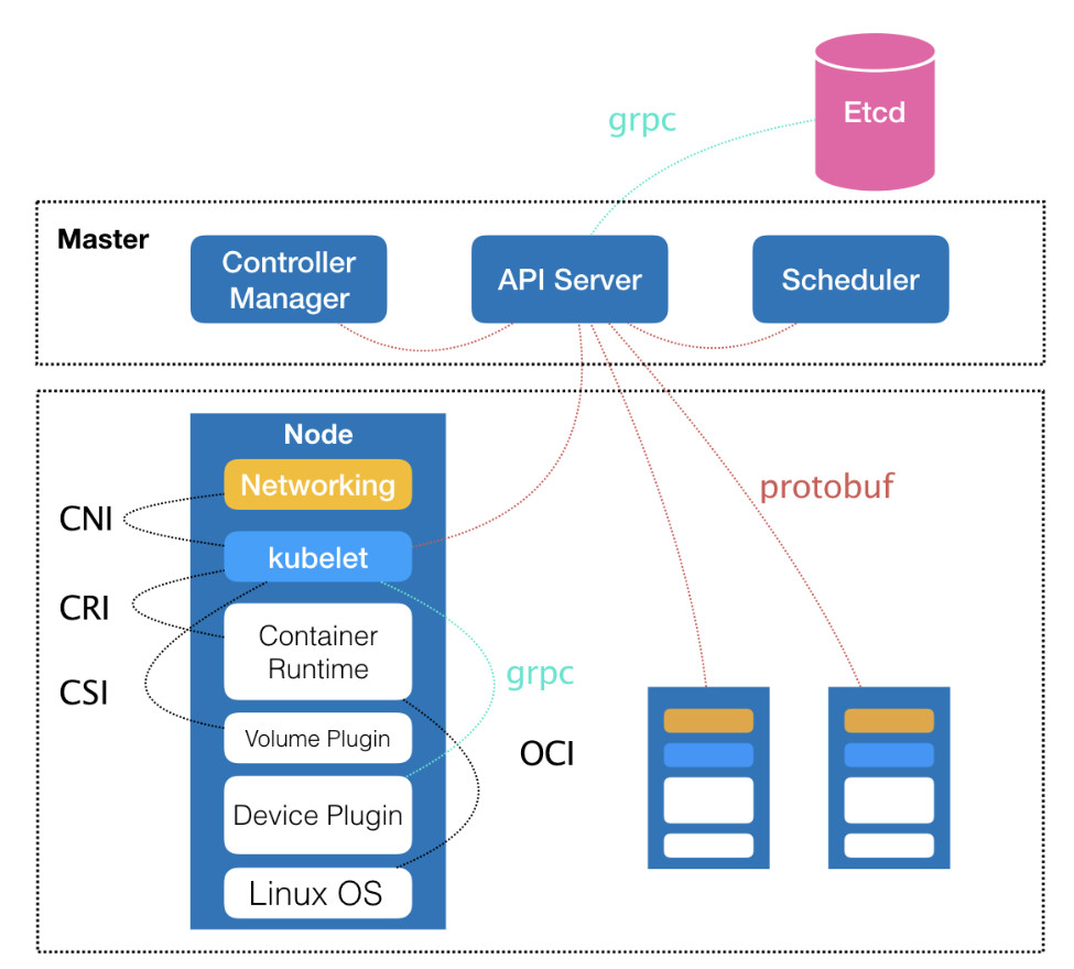 kubelet 还通过 gRPC 协议同一个叫作 Device Plugin 的插件进行交互。这个插件,是 Kubernetes 项目用来管理 GPU 等宿主机物理设备的主要组件; kubelet 的另一个重要功能,则是调用网络插件和存储插件为容器配置网络和持久化存储,交互的接口是CNI和CSI;