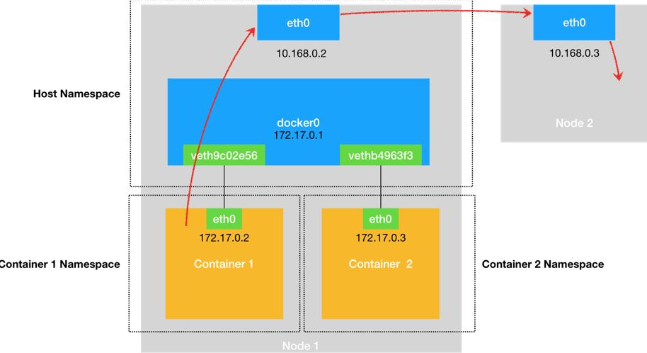 一个节点内的容器访问另一个节点一般流程:先经过docker0网桥,出现在宿主机上,根据路由表或者nat的方式,知道目标节点是其他机器,则将数据转发到宿主机的eth0网卡上,再发往目标节点。