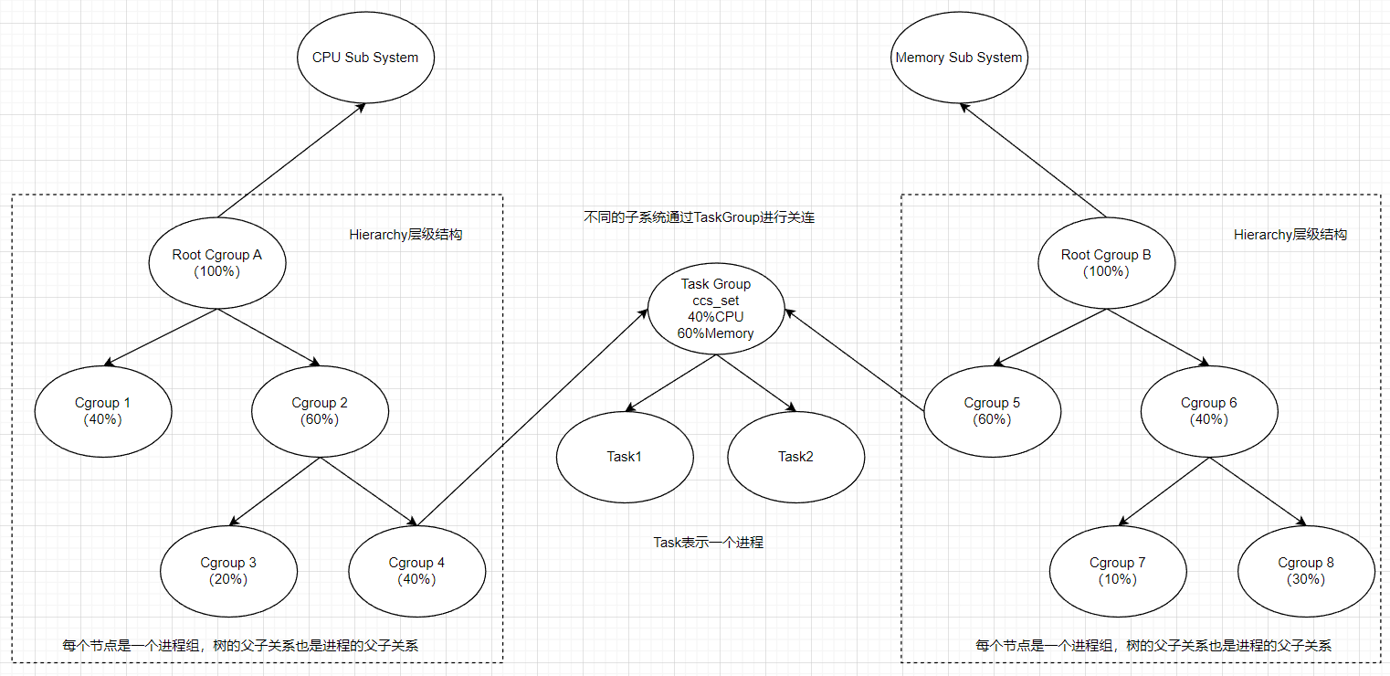 Cgroups 通过不同的子系统限制了不同的资源,每个子系统限制一种资源。每个子系统限制资源的方式都是类似的,就是把相关的一组进程分配到一个控制组里,然后通过树结构进行管理,每个控制组都设有自己的资源控制参数。