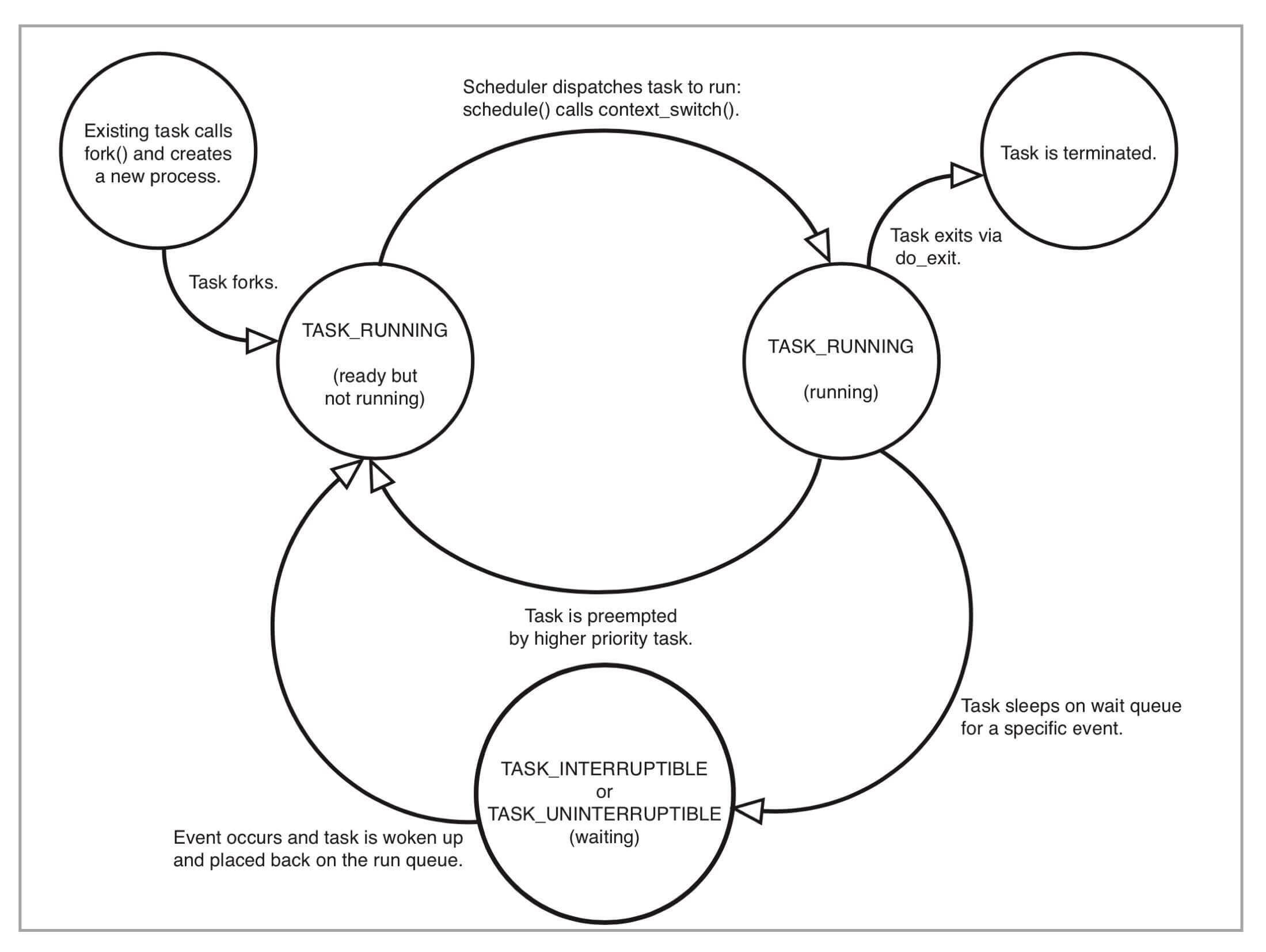 睡眠态(TASK_INTERRUPTIBLE、TASK_UNINTERRUPTIBLE):因为需要等待某些资源而被放在了wait queue队列,该状态包括两个子状态: