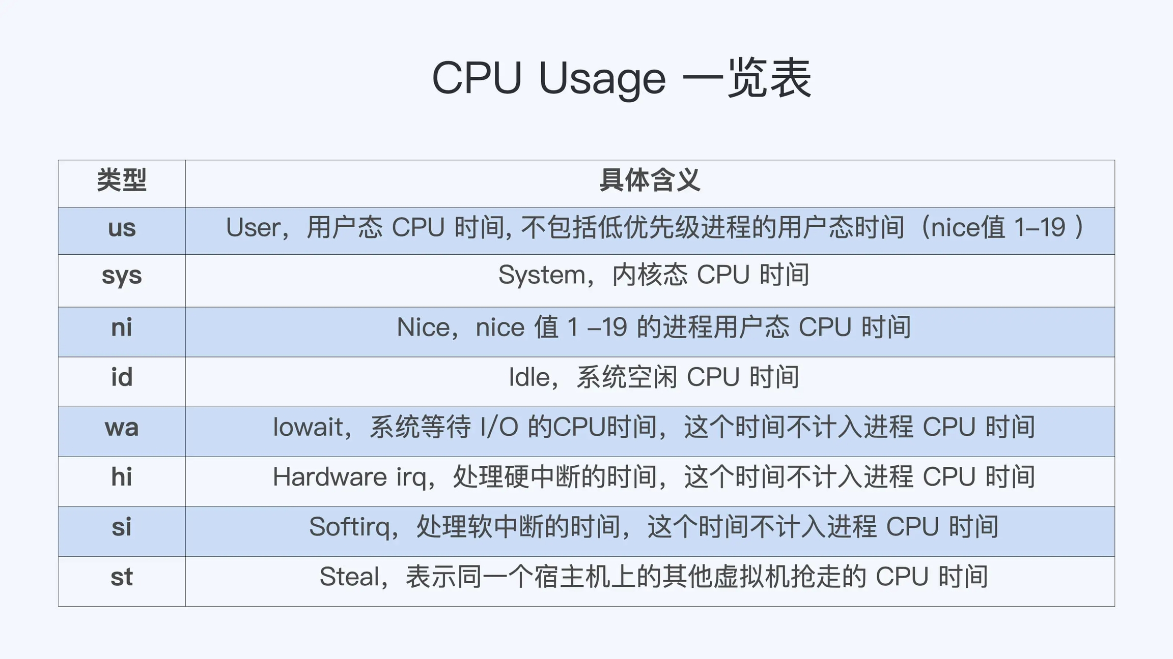 因为top命令对于单个进程读取/proc/[pid]/stat里面包含进程用户态和内核态的ticks数目,对于整个节点读取的是/proc/stat里各个不同CPU类型的ticks数目,因为这些文件不属于任何一个Namespace,因此无法读取单个容器CPU的使用率,只能通过CPU Cgroup的控制组内的cpuacct.stat参数文件计算得到,该参数文件包含了这个控制组里所有进程的内核态ticks和用户态ticks的值,带入公式即可计算得到。
